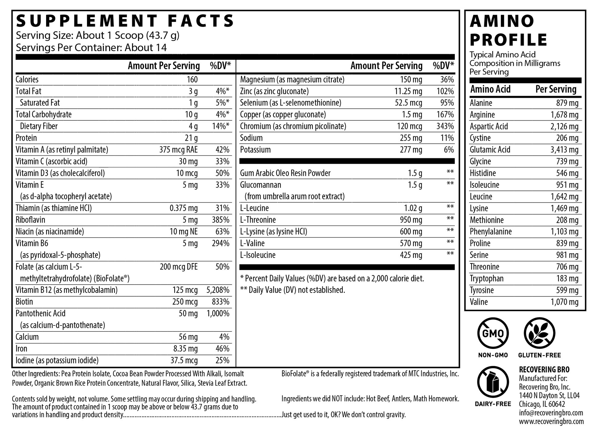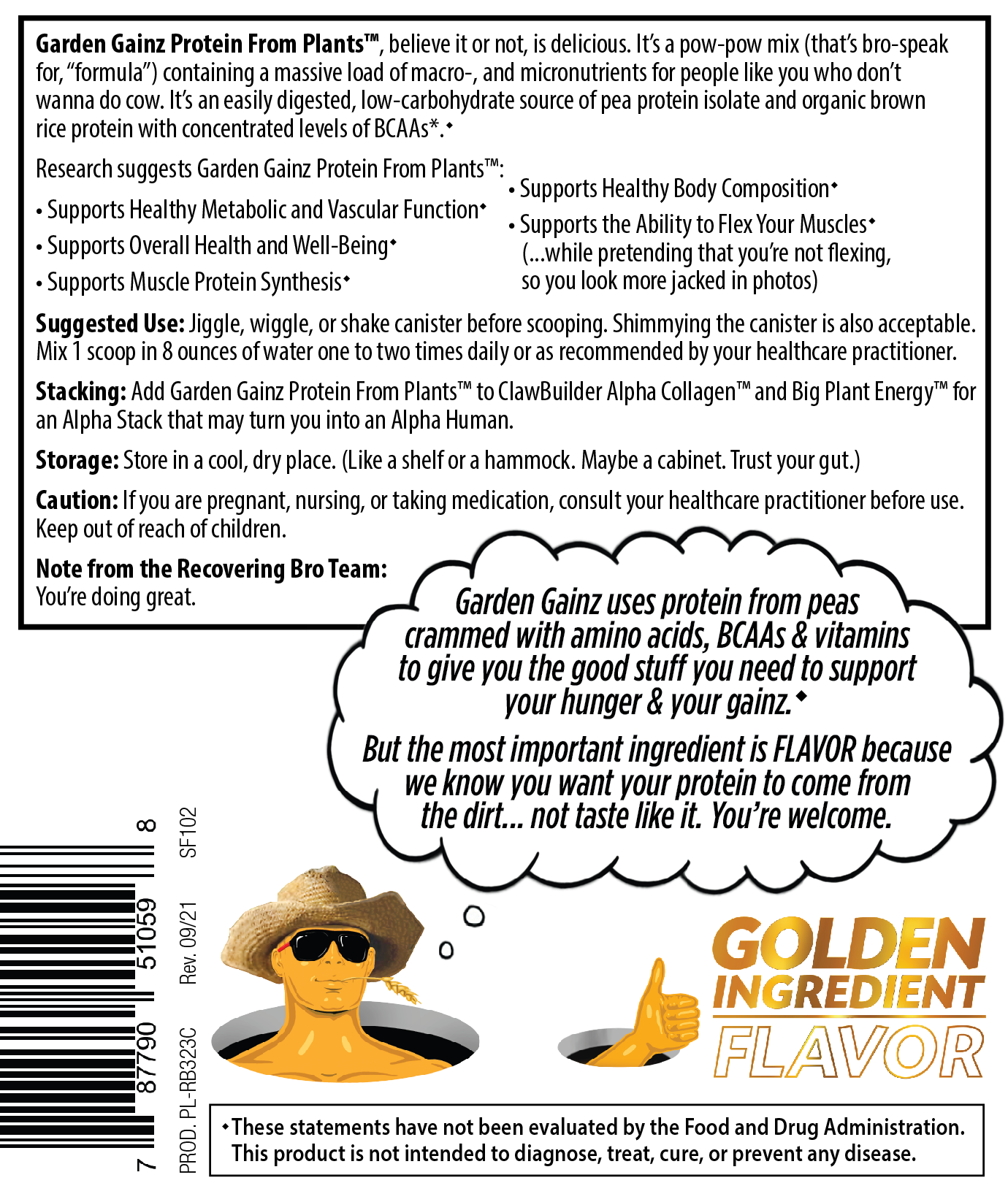 Garden Gainz™ is a plant-based protein with a complete profile of amino acids and BCAAs. We crammed a lot of vitamins in it too... your body loves those. We also added pea protein which takes longer to leave your tum-tum, meaning it helps keep you not-hungry. Because it’s plants (no dairy) it’s easier to digest so there’s less bloating. But our most important ingredient is FLAVOR because we know you want your protein to come from the ground but not taste like fertilizer. You’re welcome.