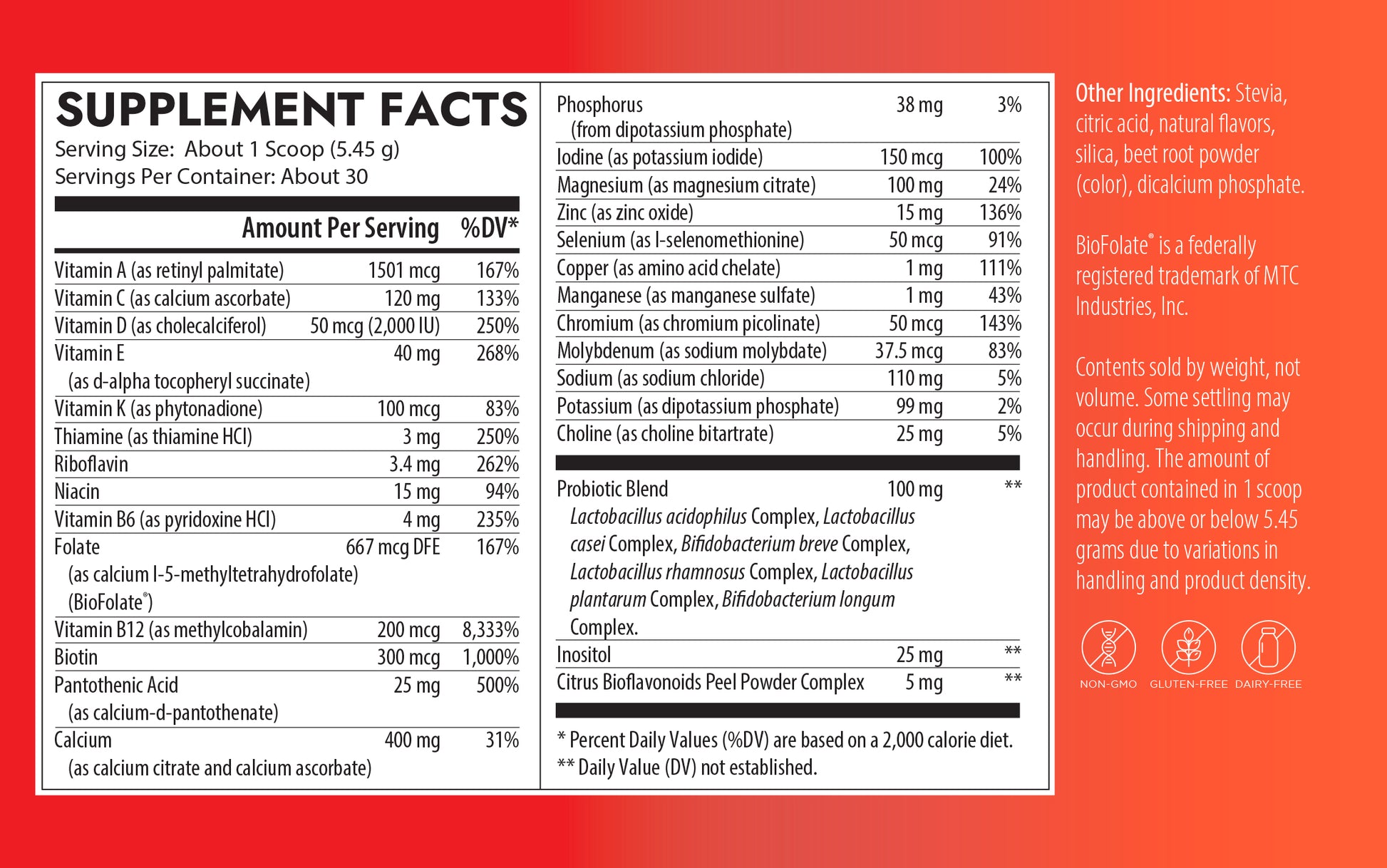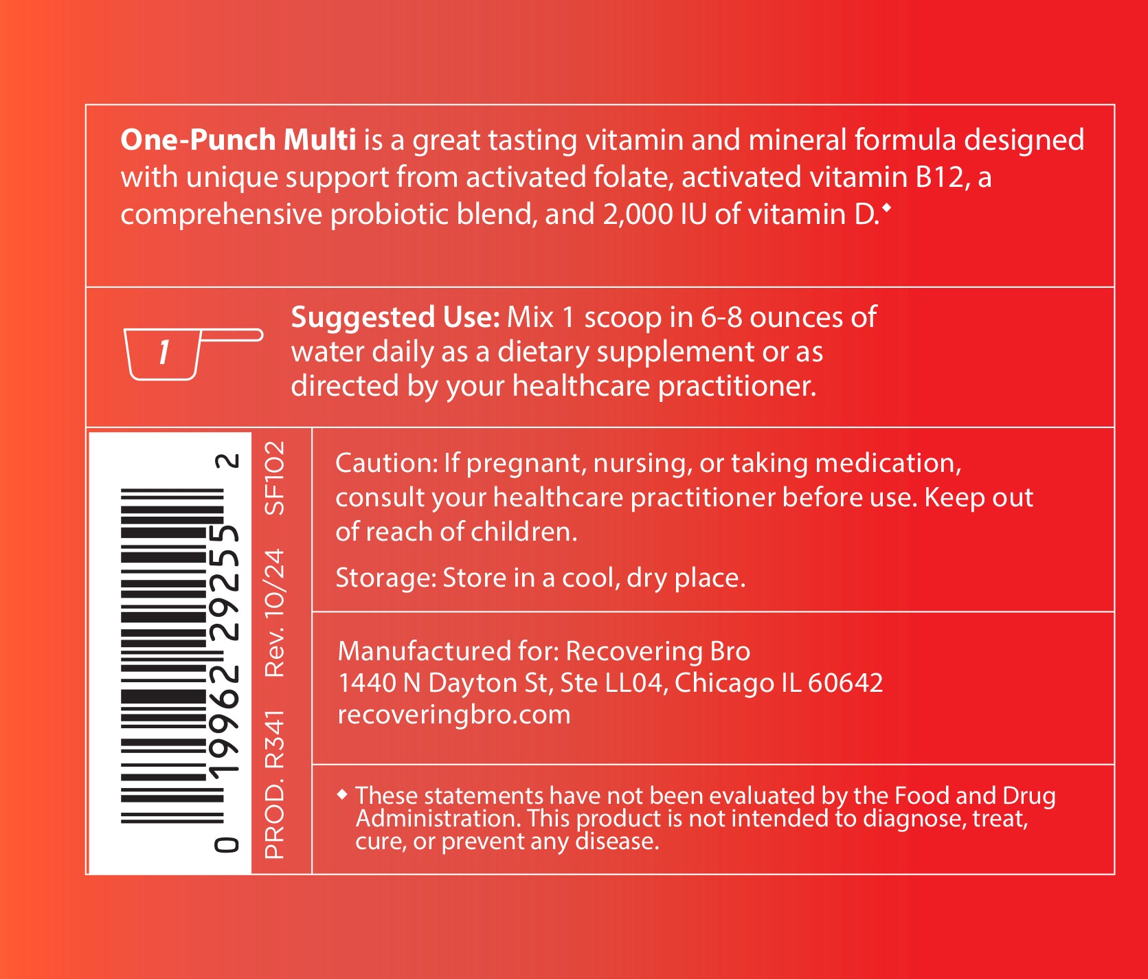 One-Punch Multi™ is a gluten-free, dairy-free, non-GMO powder that delivers a knockout combo of bioavailable vitamins, essential minerals, and six potent probiotic strains. It’s built to back your body from the inside out—supporting energy, mood, skin, immunity, gut health, and more. With just one scoop a day, you're feeding your system the good stuff it actually recognizes and uses. No fluff, no fillers—just advanced nutritional support that hits hard.