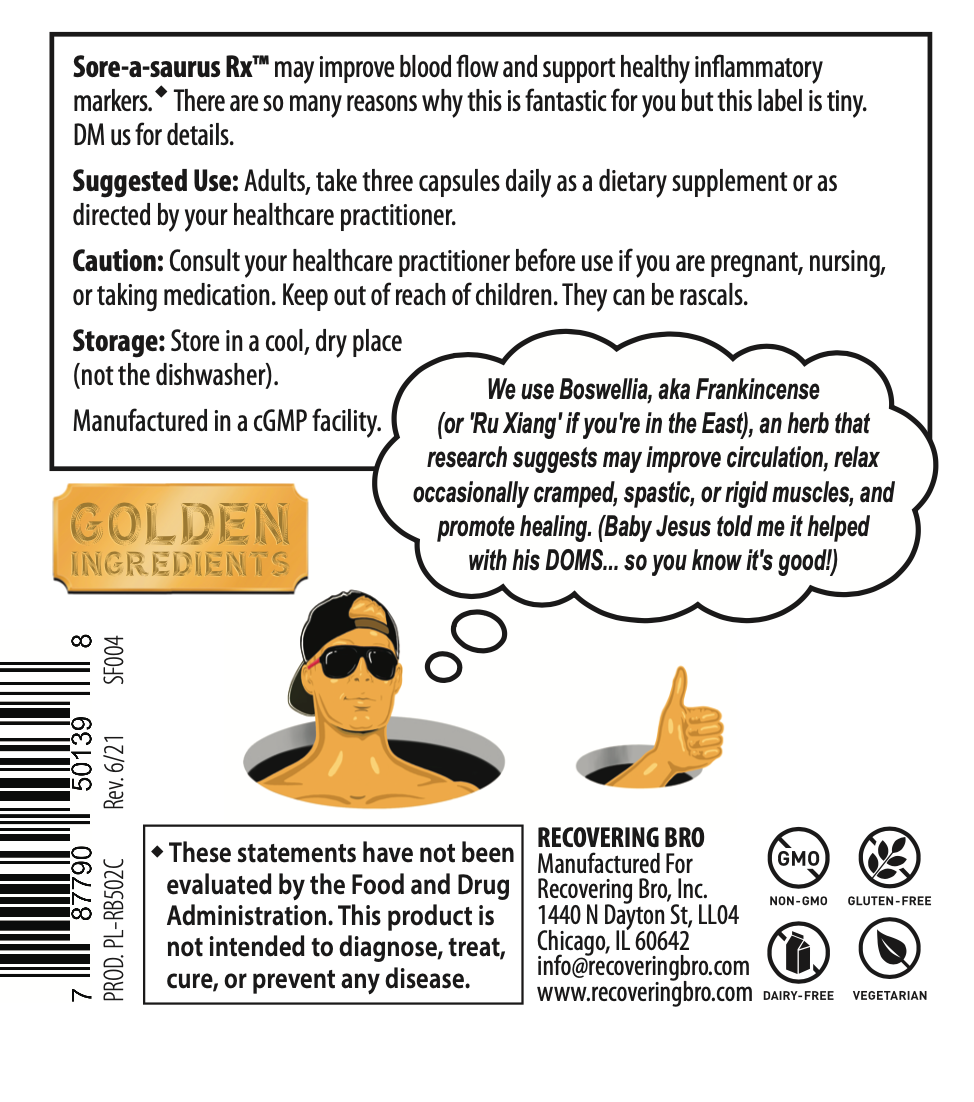 This could help reduce Delayed Onset Muscle Soreness (DOMS), but use it wisely because sometimes DOMS leads to gainz! This stuff is great for supporting inflammation recovery from fat loss programs that have you workin’ your tail off. It might also be helpful if you’re just inflamed all the time from lifestyle habits, chronic inflammation, or for when your body is maturing (beautifully, I might add) and not recovering like it used to. Sore-A-Saurus Rx may also help with physical trauma like gettin’ clobbered by your sparring partner, stubbing your toe, or slipping on a banana peel (classic).
